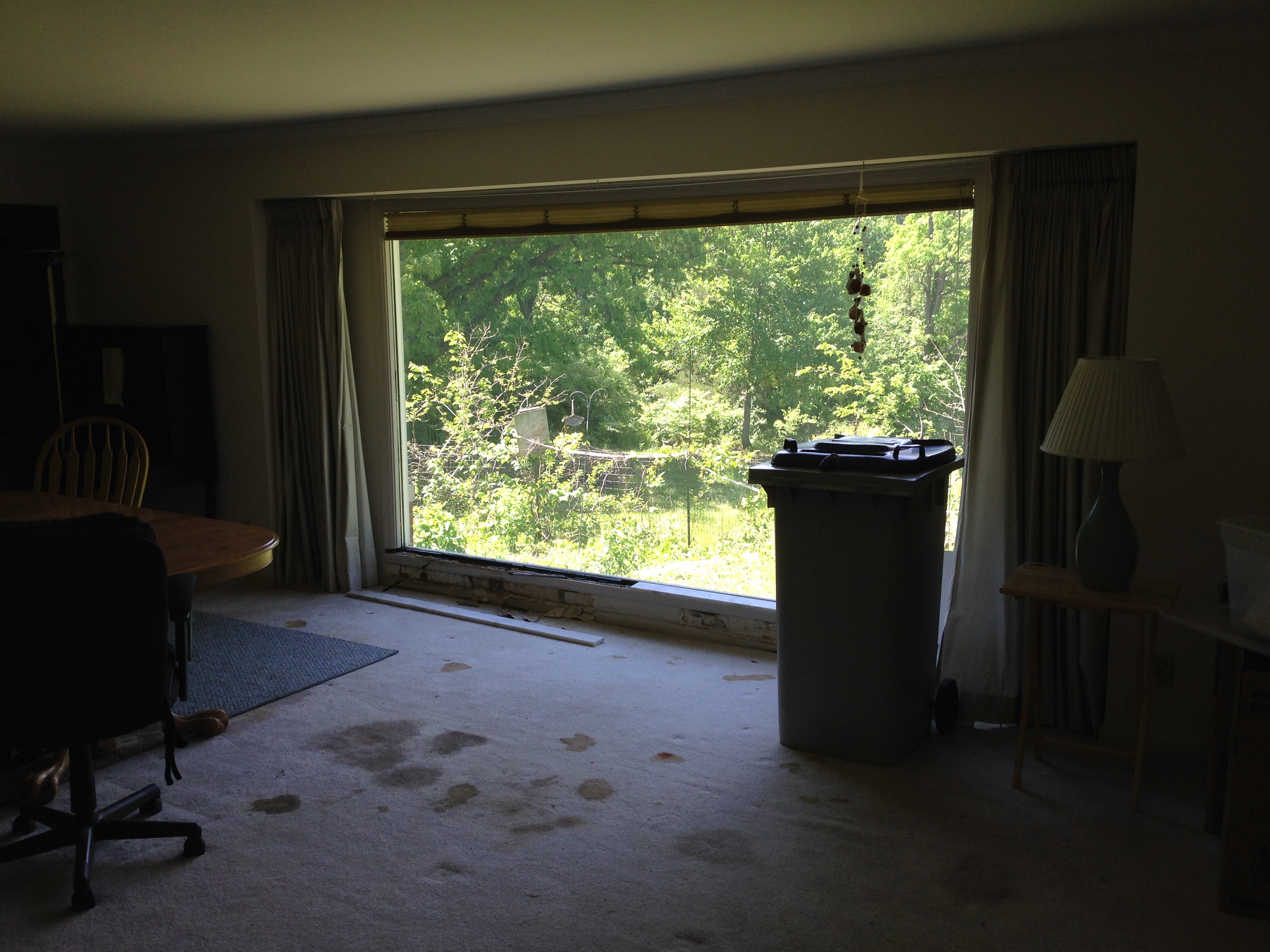 The window in the living room that needs to be replaced. It’s been leaking and there’s water damage to the wall below it.
