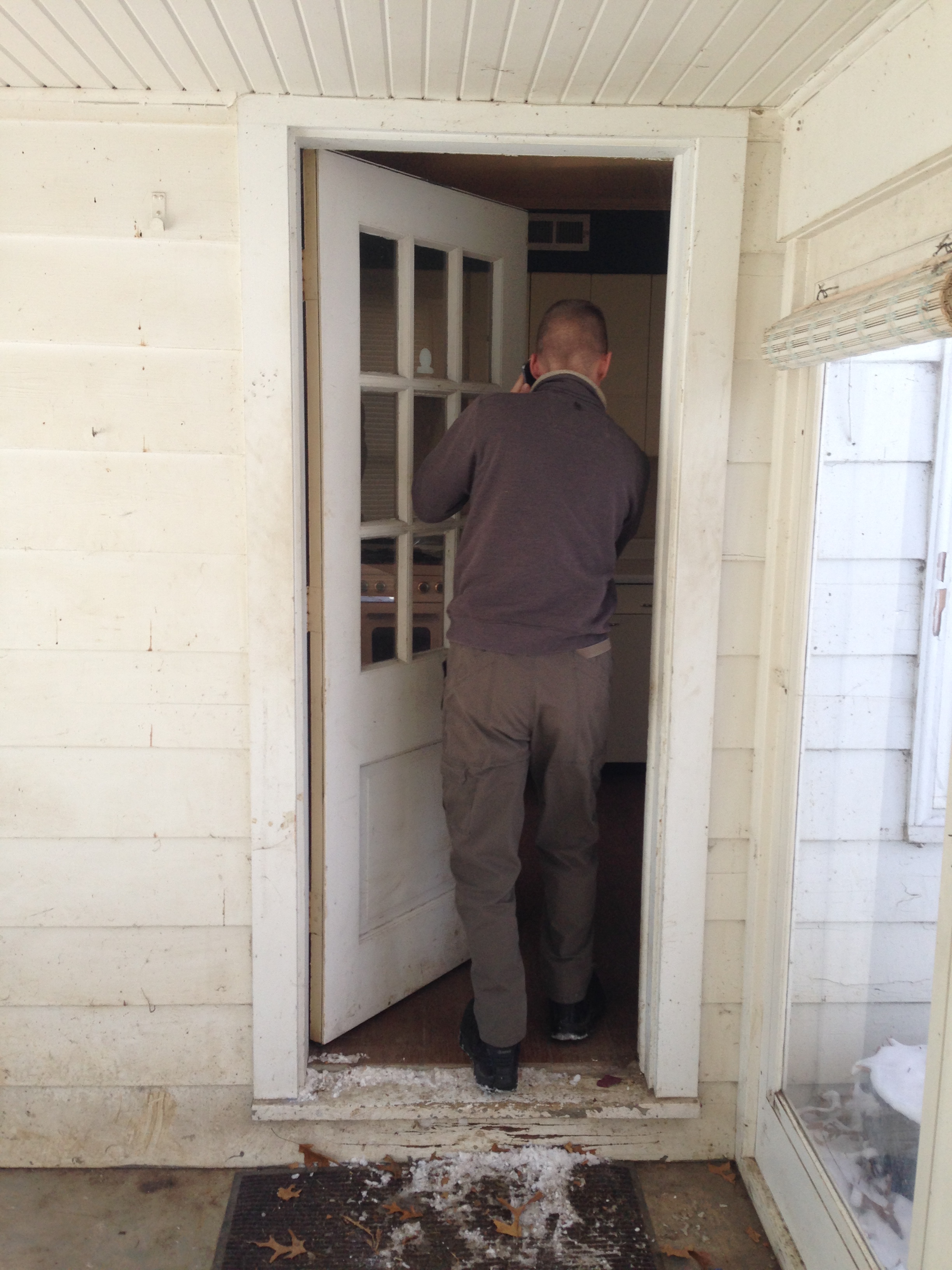 Jeremiah walking into the little house. The mudroom still needs to be cleaned and possibly repainted. One door needs replaced, and tile is in its future.