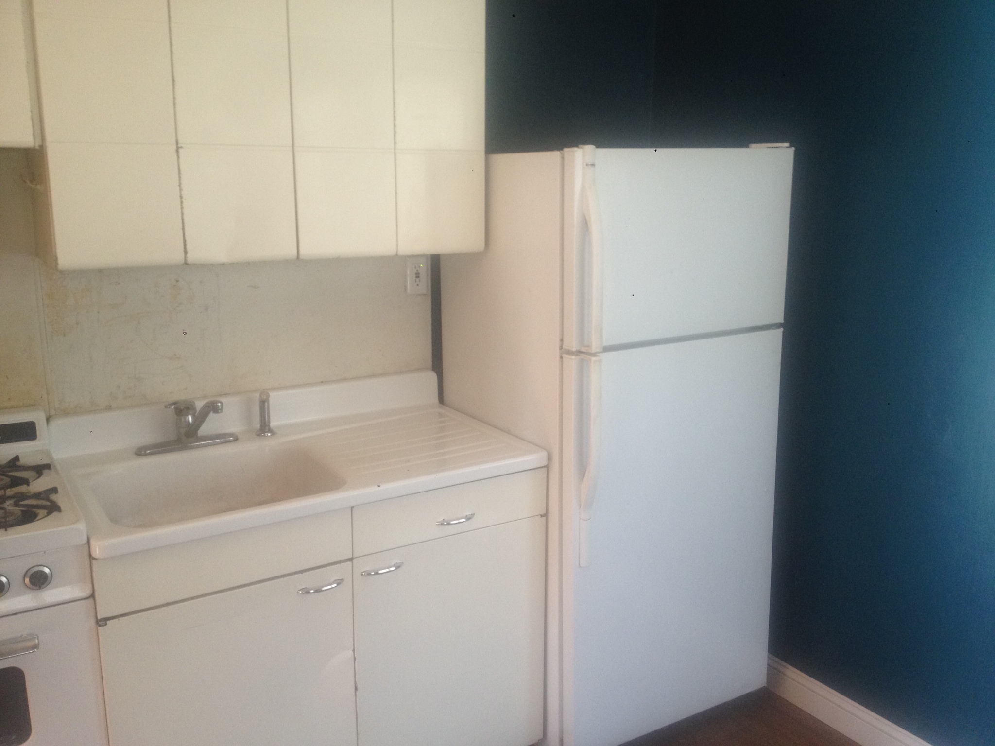 After walking into the little house via the mudroom, we were greeted by a very small, very blue kitchen. The cupboards are 1950s retro like I’ve never seen. The stove had been disconnected for a long, long time. I love to cook, and so does the future occupant, so we knew the limited space would be an issue.
