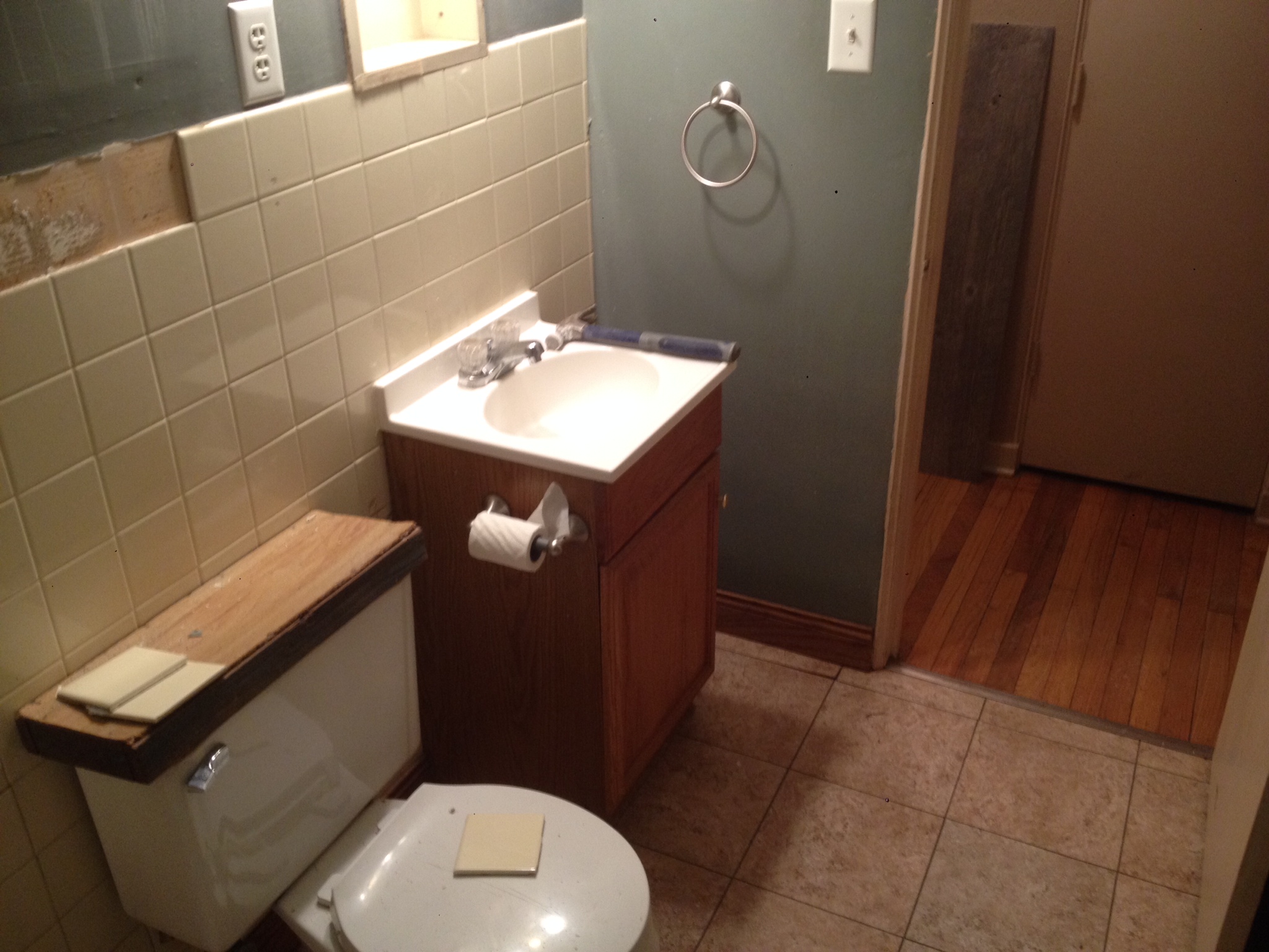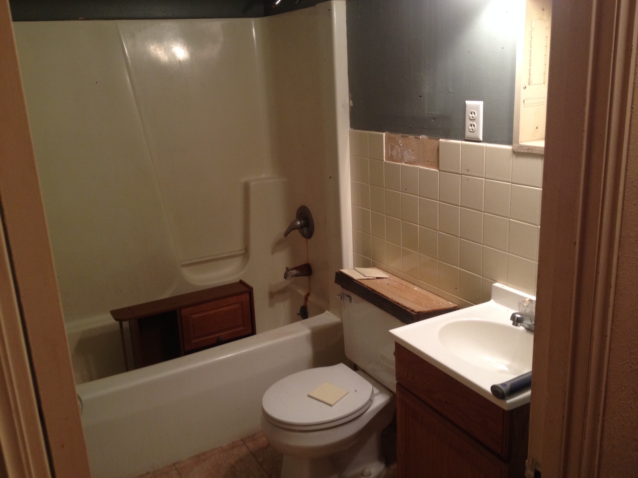 The bathroom. Yes, that is a wooden cover on the back of the toilet. Also, tile was coming off the walls. There was a hole in the bottom of the shower that had been roughly caulked and was leaking into the frame of the house. The previous tenant had painted over wallpaper (peeling) and the adhesive floor was coming up. We had to gut the room down to the studs.
